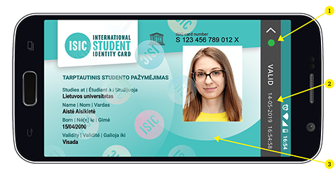 - Galiojantis virtualus ISIC pažymėjimas žymimas VALID žaliu tašku šalia;
