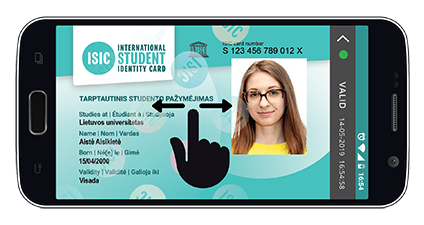 Kiekvienas virtualus ISIC pažymėjimas gali būti pabraukiamas į kairę arba dešinę pusę,