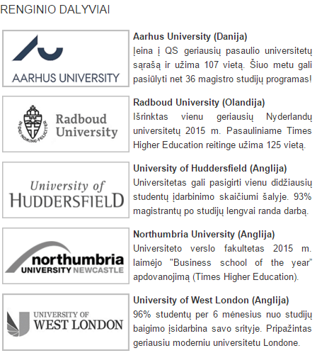- taip pat kiekvieno universiteto atstovai turės ir savo stendą, prie kurio priėjus bet kuriuo renginio metu kiekvienas susidomėjęs žmogus turės galimybę užduoti sau aktualius klausimus.