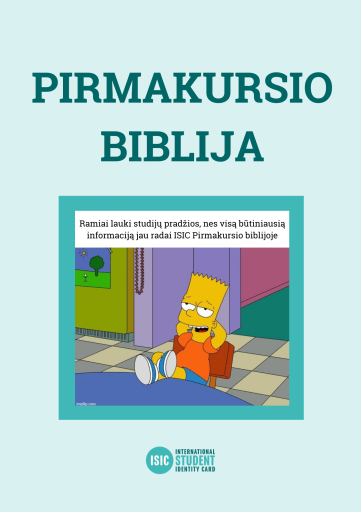 Su ISIC pasiruošti studijoms ypač LENGVA, nes sukūrėme Tau Pirmakursio bibliją – NEMOKAMĄ elektroninį leidinį, kuriame rasi visą svarbiausią informaciją, kurią privalo žinoti kiekvienas pirmakursis!
